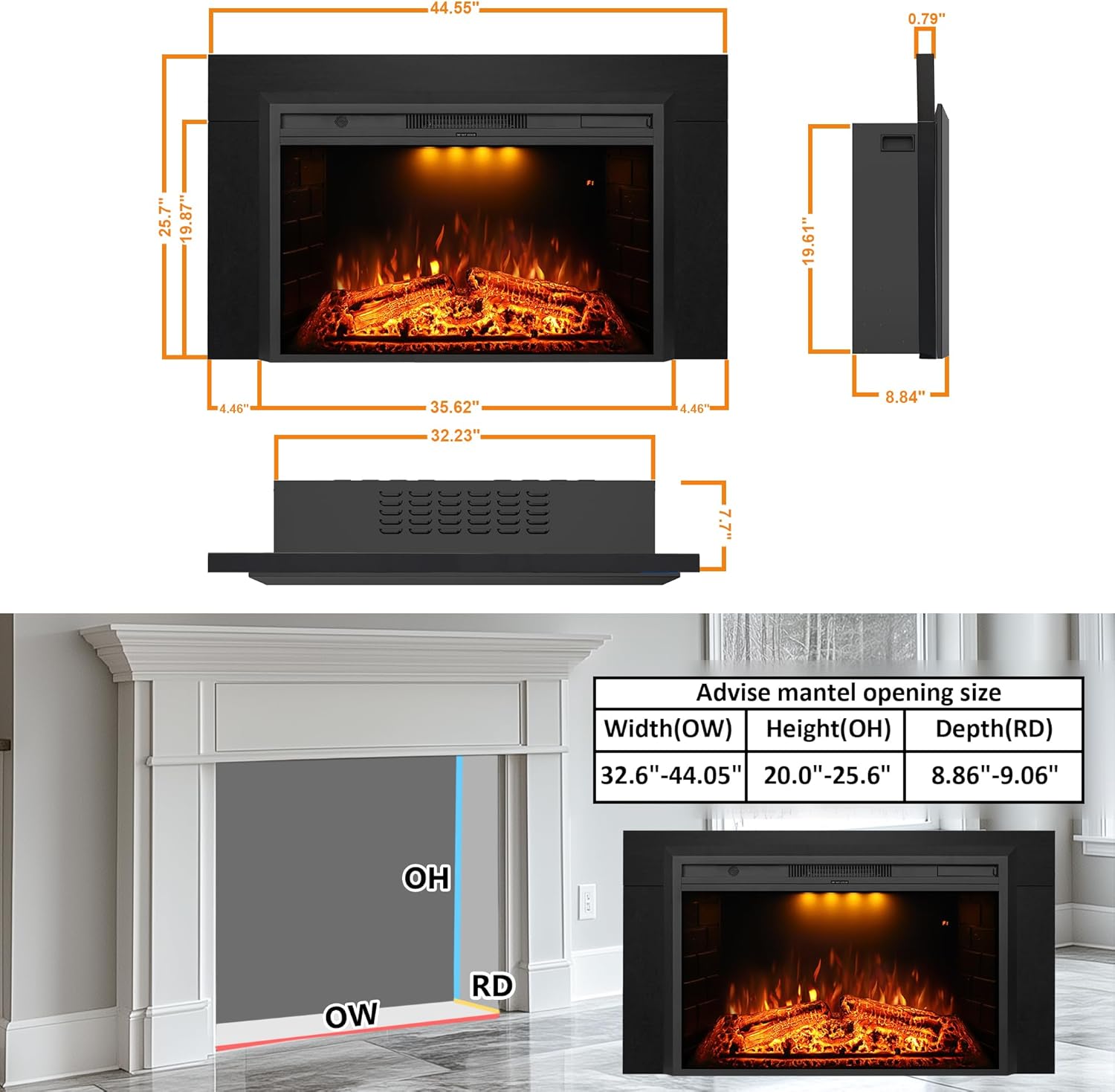 EFT 36" Electric Fireplace Insert with Trim Kit (Low Profile) | Fits Max Opening 44"x25" | Realistic Audio Effect