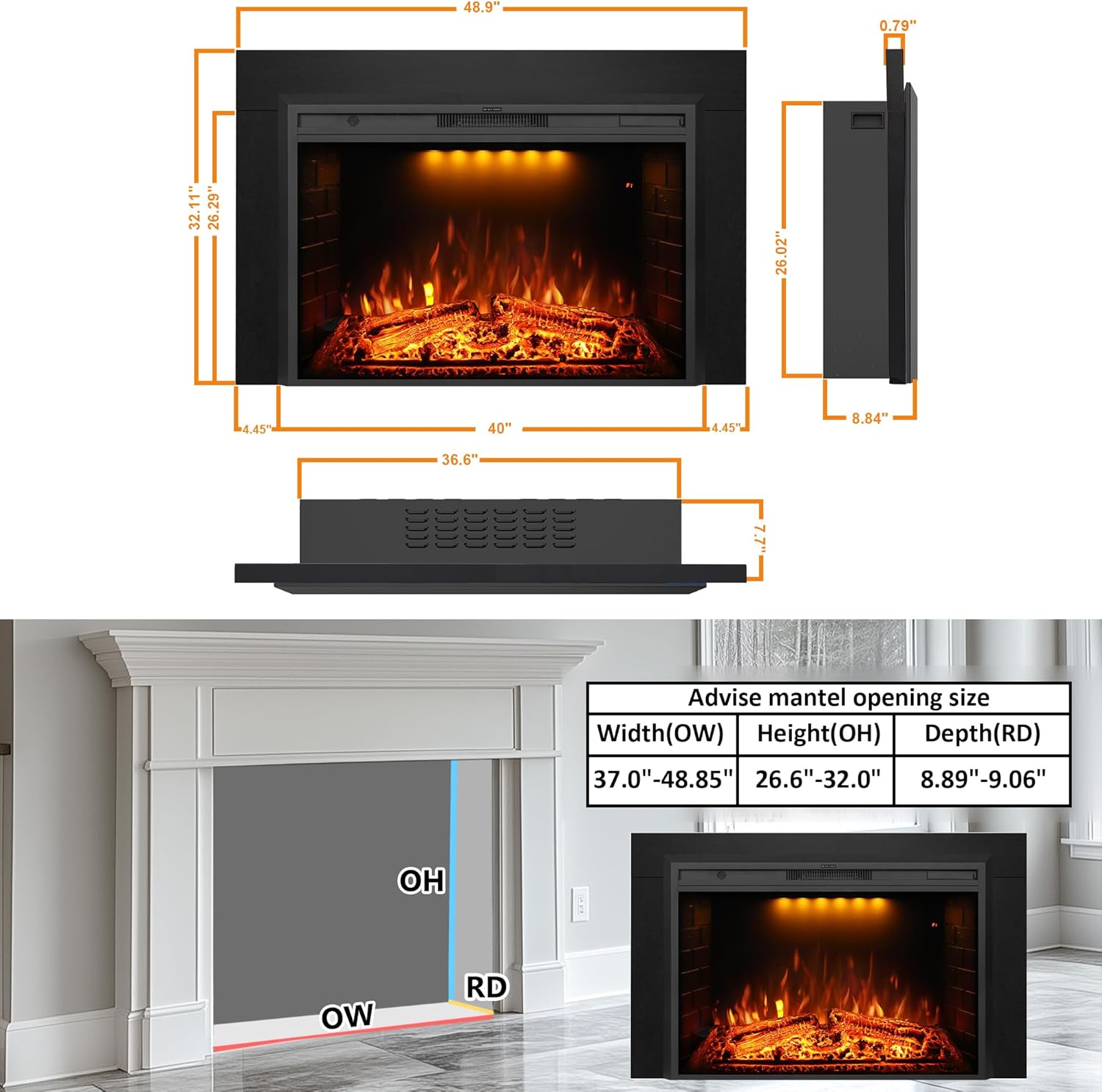 EFT 40" Electric Fireplace Insert with Trim Kit | Fits Max Opening 48.8"x32" | Realistic Sound & Remote