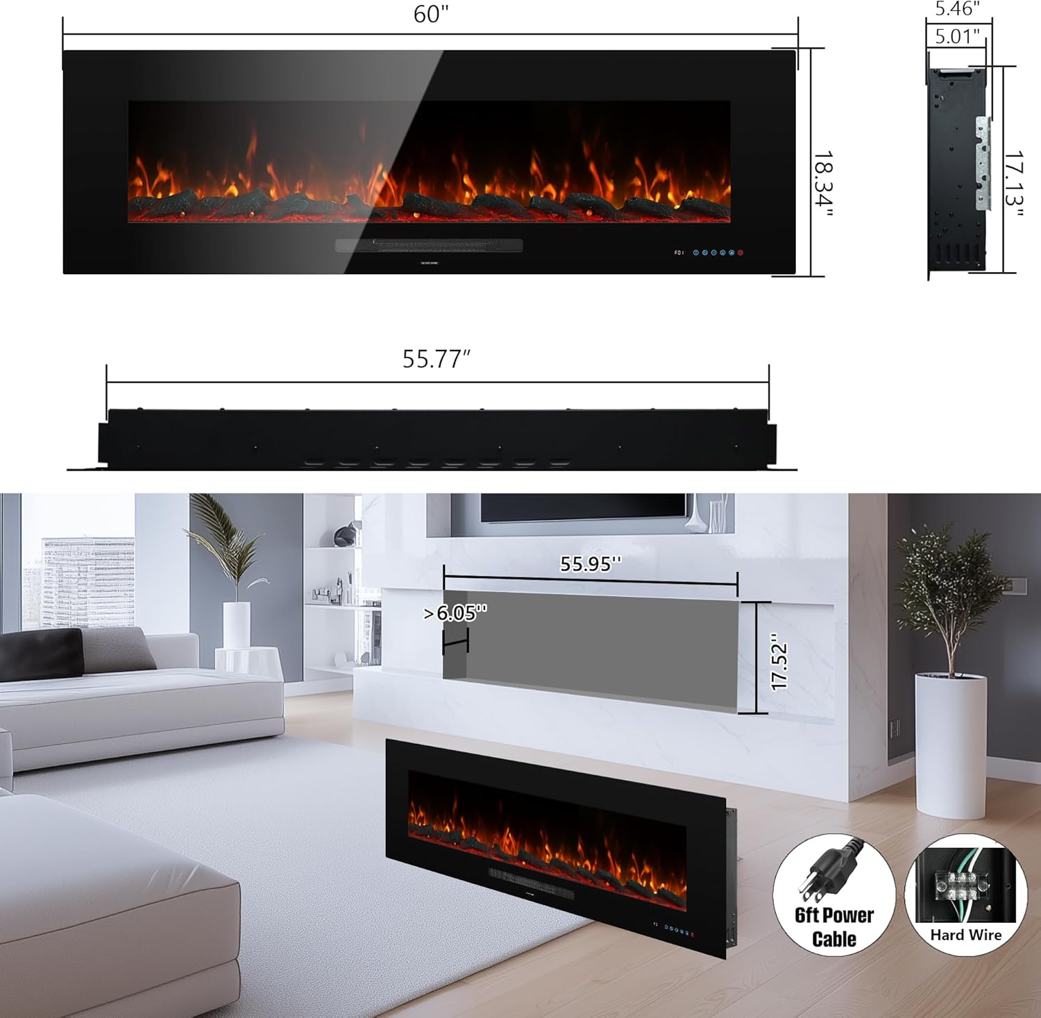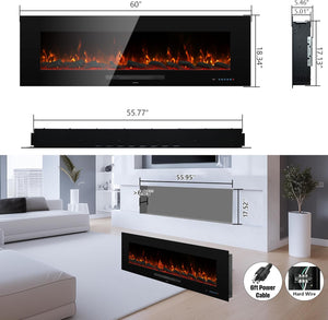 WMDR Series 60" Electric Fireplace | Recessed & Wall Mounted Heater with 13 Flame Colors