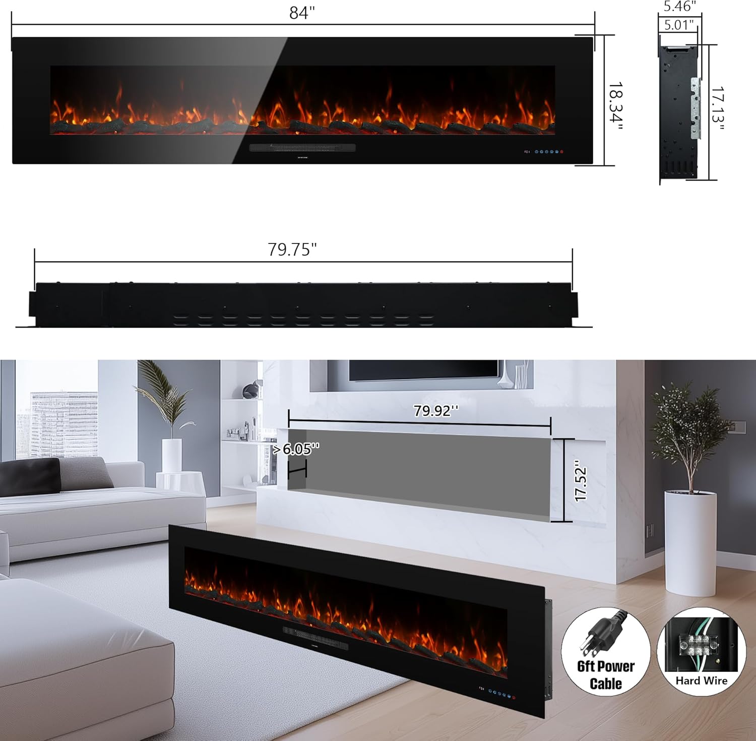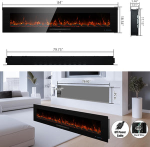 WMDR Series 84" Electric Fireplace | Recessed & Wall Mounted Heater with 13 Flame Colors
