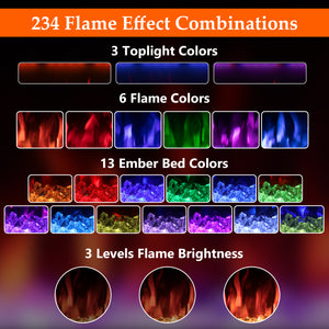 This electric fireplace features a streamlined appearance, crafted from high-quality materials and a tempered glass panel, exuding a modern sense. The multi-color flame burns within the firebox, creating a warm and peaceful atmosphere that brings a relaxed feeling. Enjoy up to 234 flame combination options!