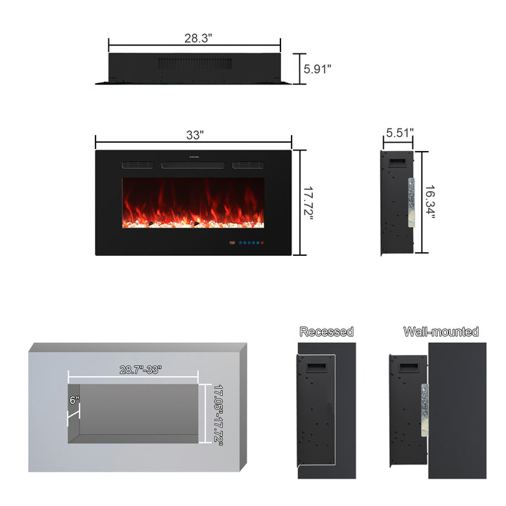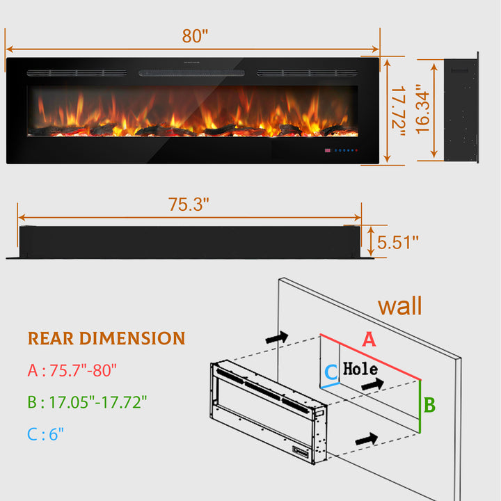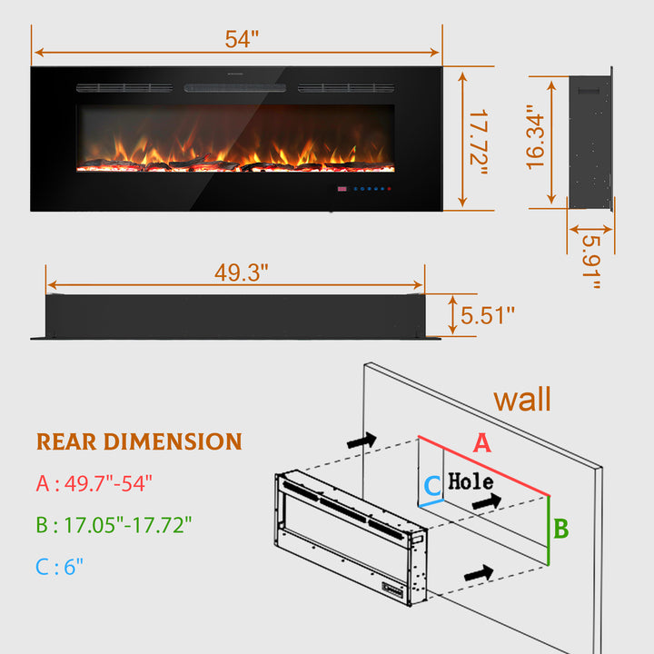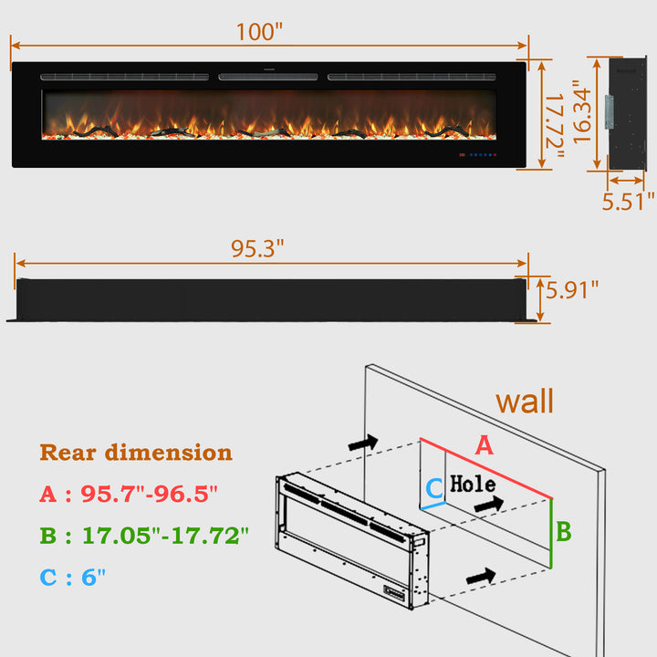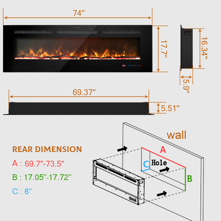 【Multi-function】Remote control and touch screen two control methods. 1-9 hour timing. 750W(LO)/1500W(HI) 2 heating modes up to 400 square feet (heating mode can be turned off, leaving only the flame effect). The electric fireplace has a thermostat for a fixed temperature range from 62℉to 99℉ (17℃to 37℃). Overheat protection system, temperature above 100℃ /212℉, automatic shutdown to protect your safety. Use with 120V voltage.