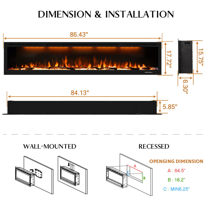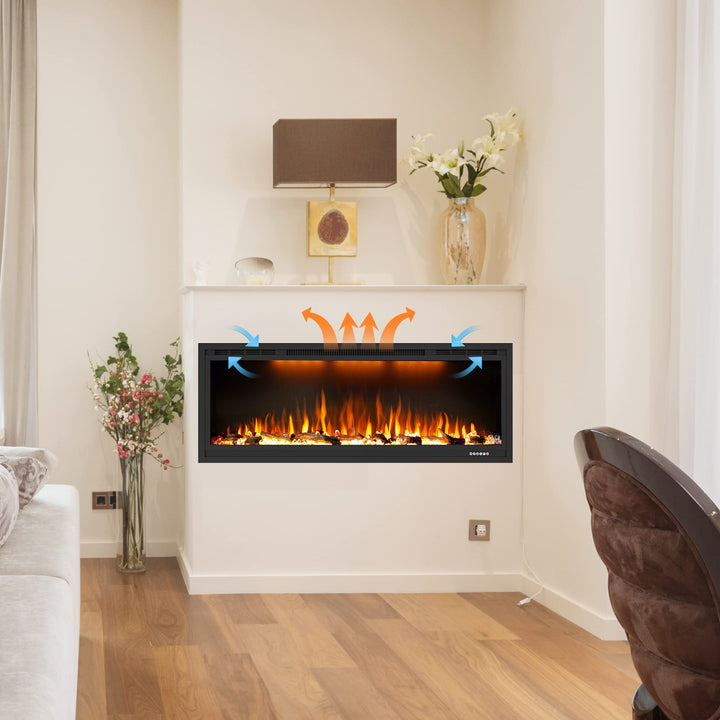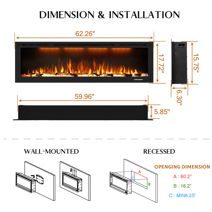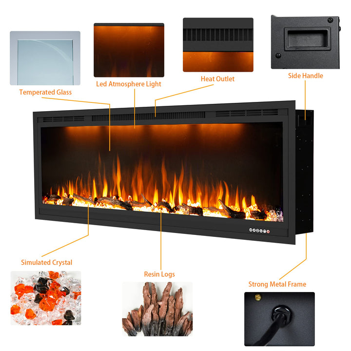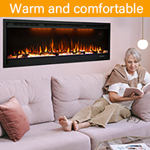 - 【Multi-function】Fast heating, dual power 750W/1500W(5100BTU). Electric wall fireplaces are suitable for Spaces up to 400 square feet. The temperature can be set to 71°F-99°F. The timer can be set to 1H to 9H. You can use the touch screen or remote control to operate, convenient and fast. This electric fireplace comes with an overheat protection system, which automatically shuts down when the temperature is too high to protect you and your family.