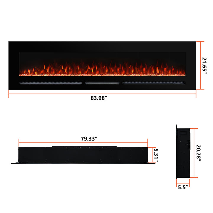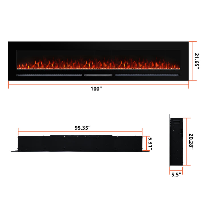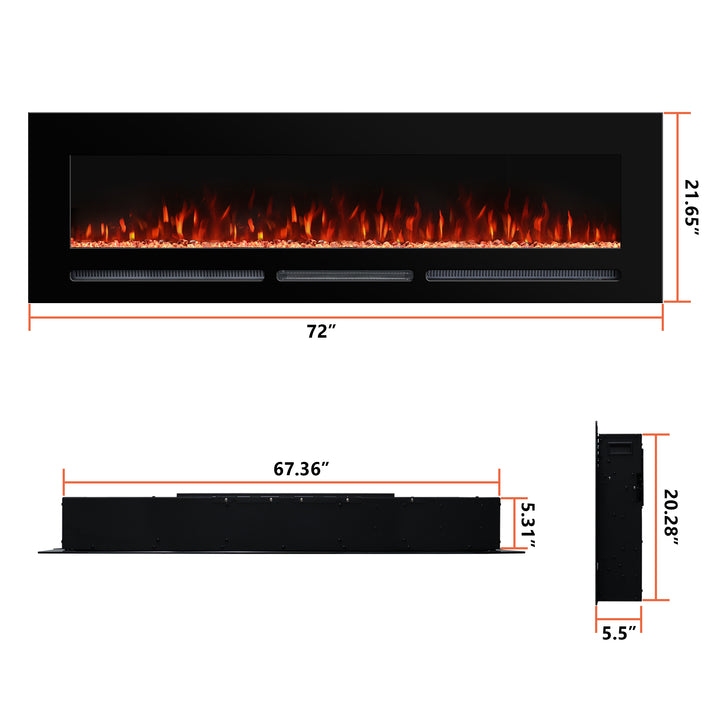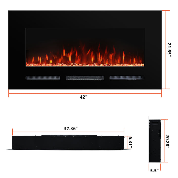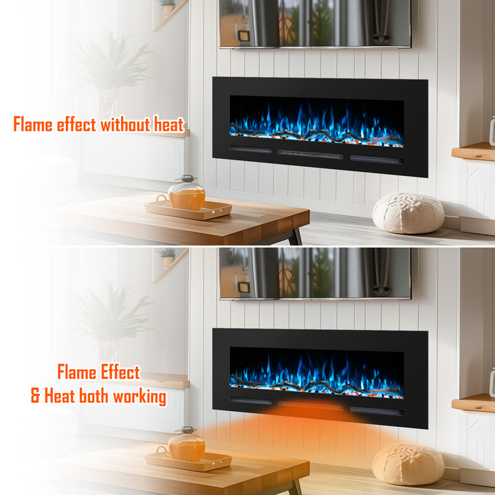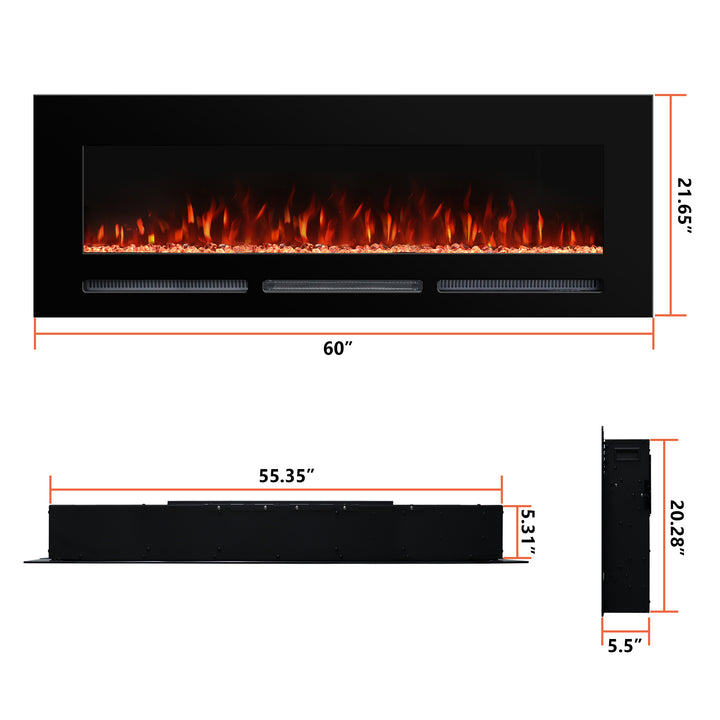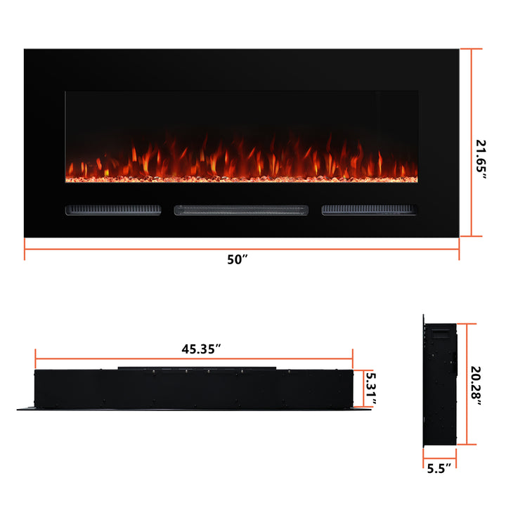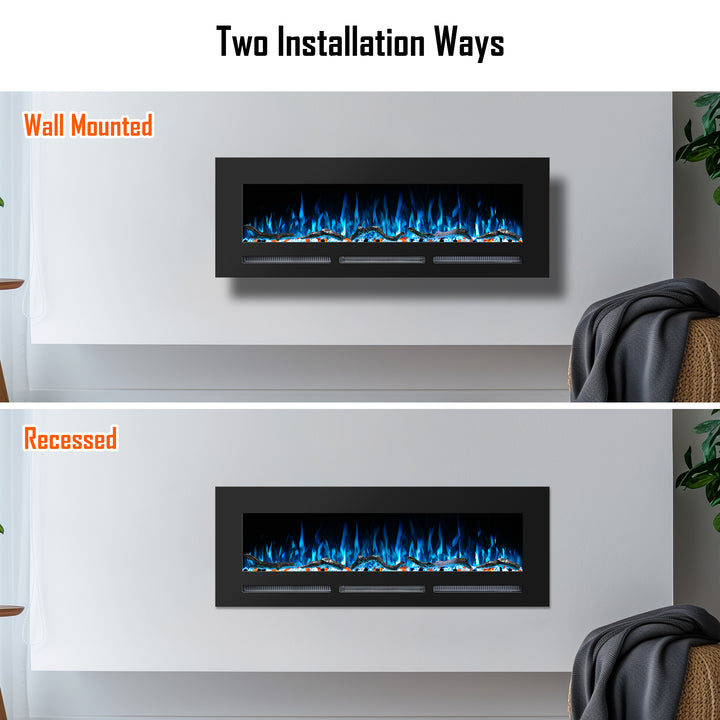 This electric fireplace heater designed for effortless recessed or wall-mounted installation. Overall Dimensions: 45.3"L x 8.9"D x 25.6"H, capable of efficiently heating rooms up to 400 sq. ft with its 5120 BTU output. Seamlessly integrates into your space while providing exceptional functionality.