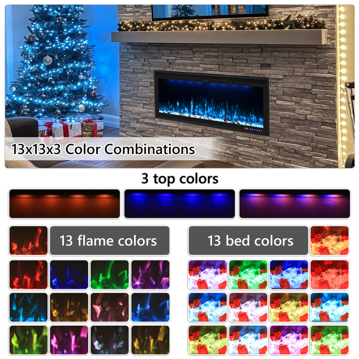 - Up to 507 colors combinations: 13 flame colors, 13 bed ember colors, 3 top light colors .