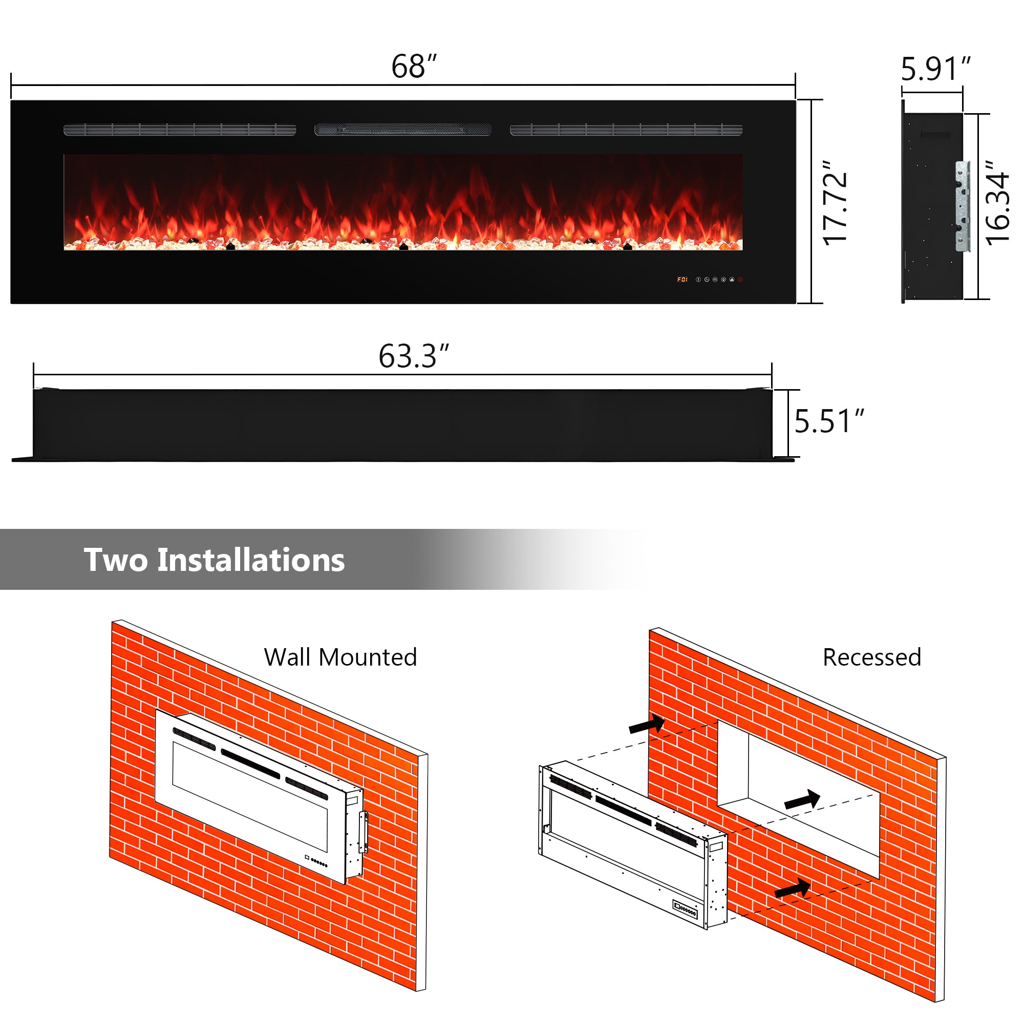EFR 68" Electric Fireplace Wall Recessed and Wall Mounted Inserts Heater&13 Flame Colors